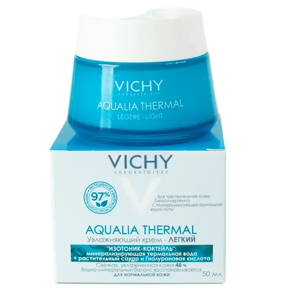 VICHY AQUALIA THERMAL Увлажняющий легкий крем для нормальной кожи, 50мл. Крем VICHY Aqualia Thermal Moisturizing Light Cream - это увлажняющее средство для нормальной кожи лица, которое содержит гиалуроновую кислоту и термальную воду в составе. Благодаря этим компонентам кожа получает необходимое количество влаги, а также становится более упругой и эластичной. Легкая текстура крема быстро впитывается, не оставляя ощущения жирной пленки или липкости. Он идеально подходит для ежедневного ухода за кожей лица, особенно в теплое время года. VICHY Aqualia Therapeutic Moisturizing Light Cream не содержит парабенов, фталатов, минеральных масел и других вредных компонентов, поэтому он безопасен для использования на коже. Он имеет приятную отдушку, которая не раздражает кожу и не вызывает аллергических реакций.